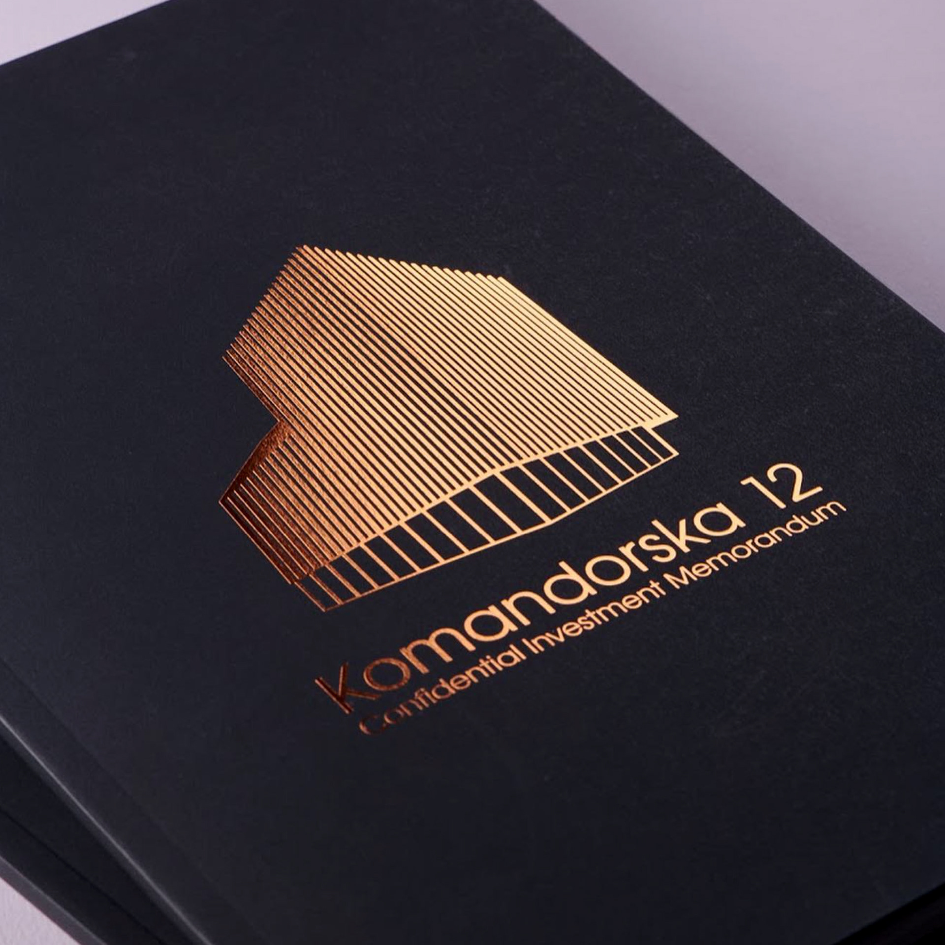 Brochure, designed to print, showcasing design opportunity to invest in boutique office building in Wroclaw city, Poland. Emblem/illustration on the cover refers to the building modern appearance and copper color it's facade.